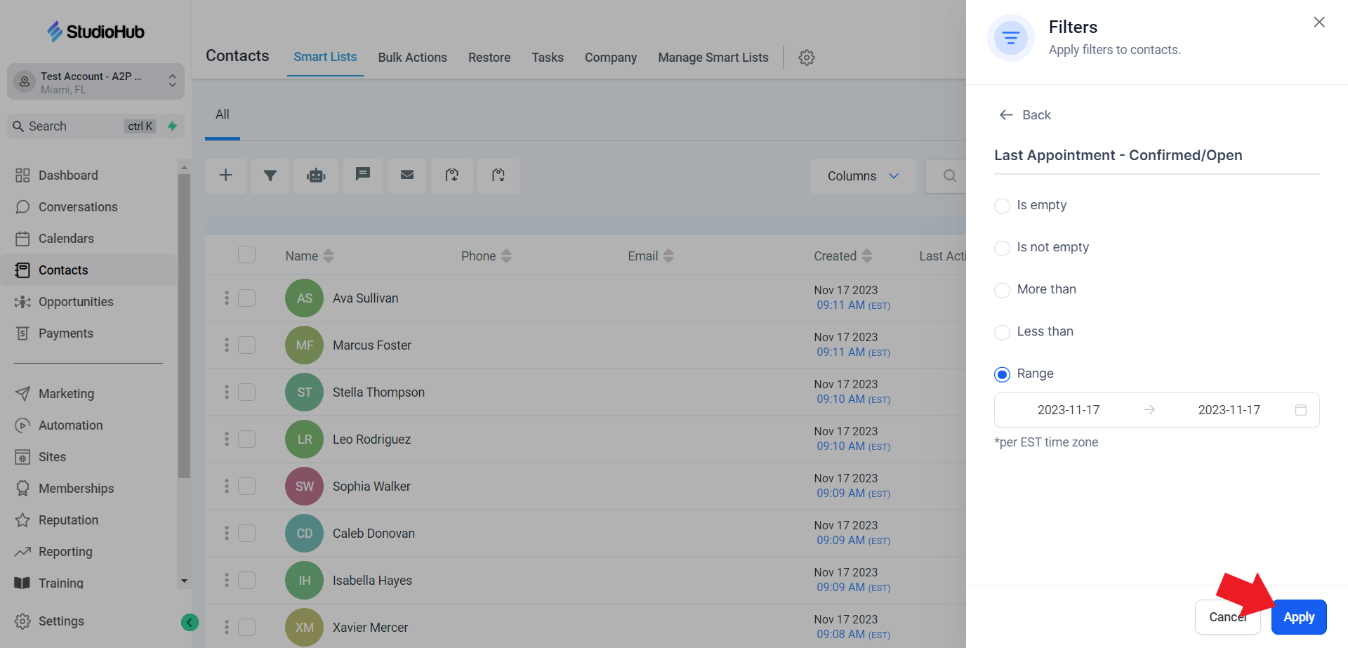- Click apply "Apply" to view contacts with appointments on that date.