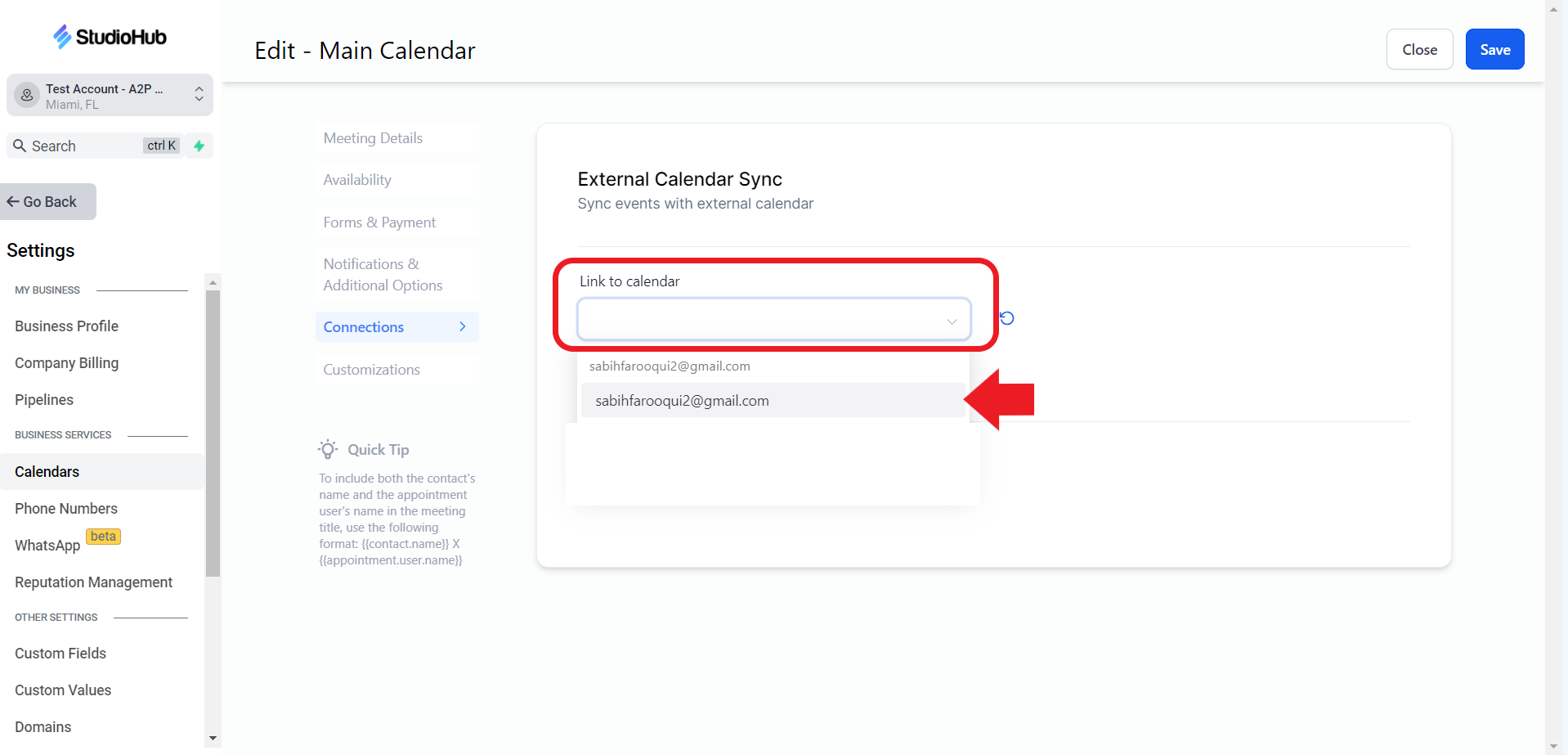 - Click on the "Link to Calendar" field, and select your Email from the drop-down