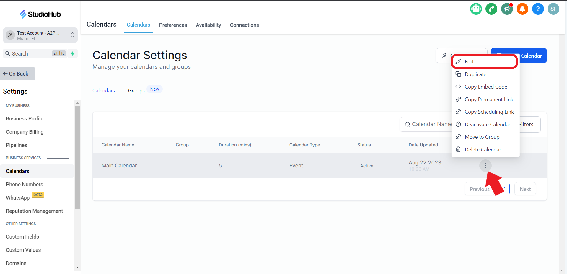 - On the "Main Calendar", click the "3 dots" under Action and click on "Edit".