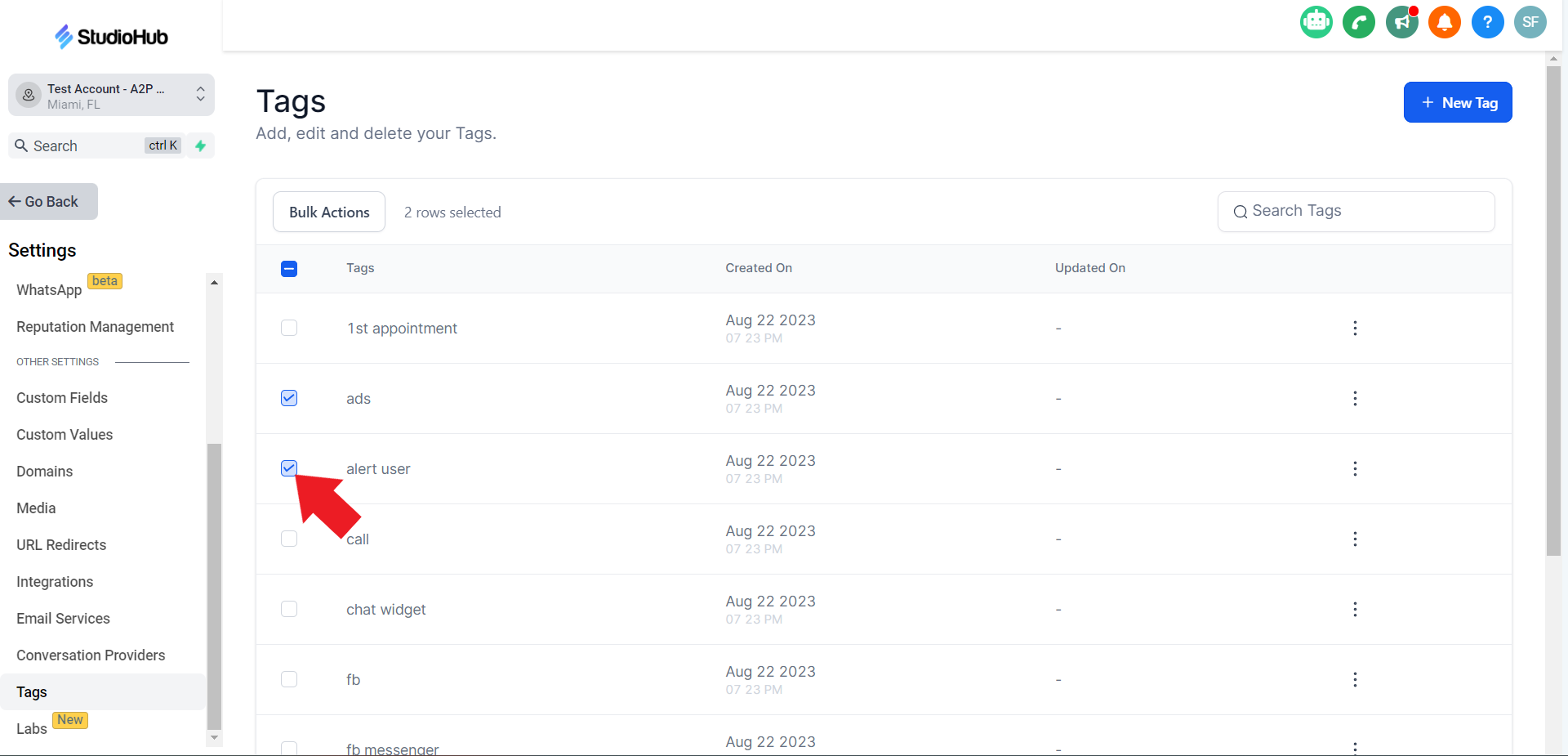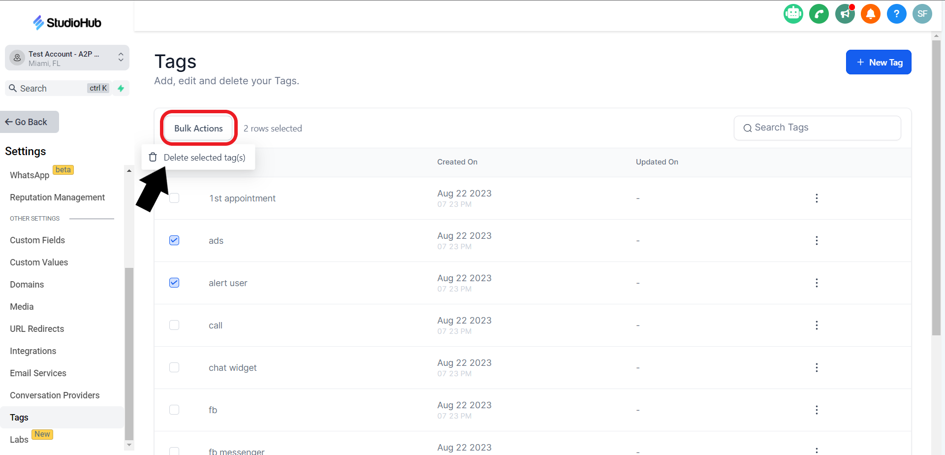 By following these steps, you'll be able to delete tags in StudioHub that are no longer needed or relevant to your workflow. Deleting unnecessary tags can help streamline your tag selection process and keep your contact management organized. Remember to exercise caution and double-check your selections to avoid deleting the tags that you need.