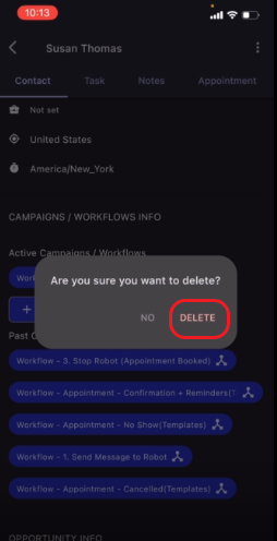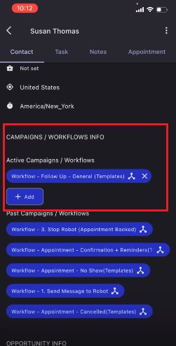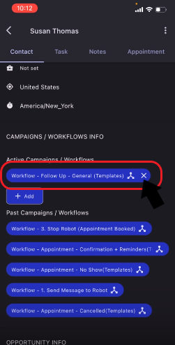 - You can see that this person is in an active workflow campaign, meaning they will keep receiving automation. To remove them from the workflow campaign click on the little X icon.