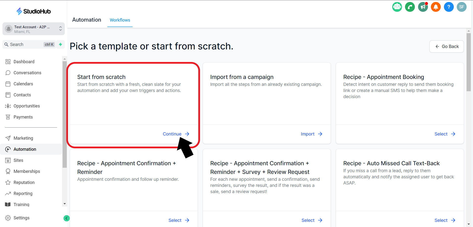 In this guide, we will walk you through the steps to create an automation workflow in StudioHub that follows up with people when they cancel their appointments. This automation will help you engage with customers who've canceled and potentially rescheduled their appointments. Follow these steps to set up the workflow efficiently.