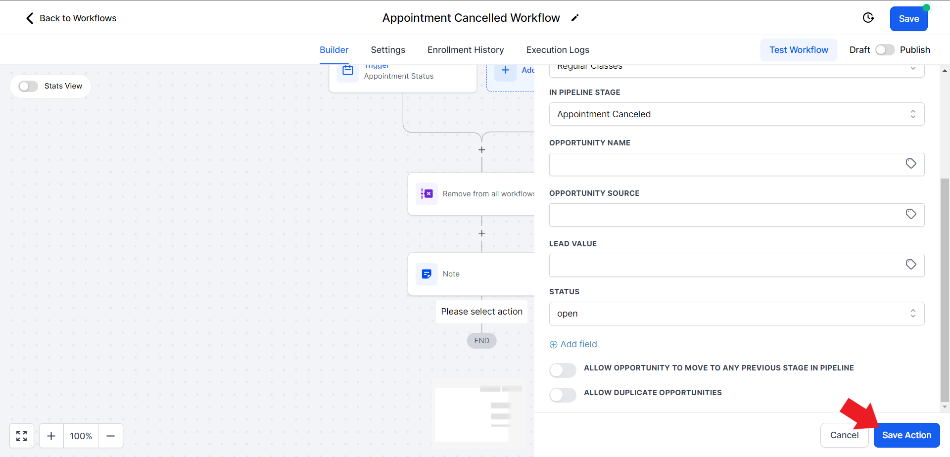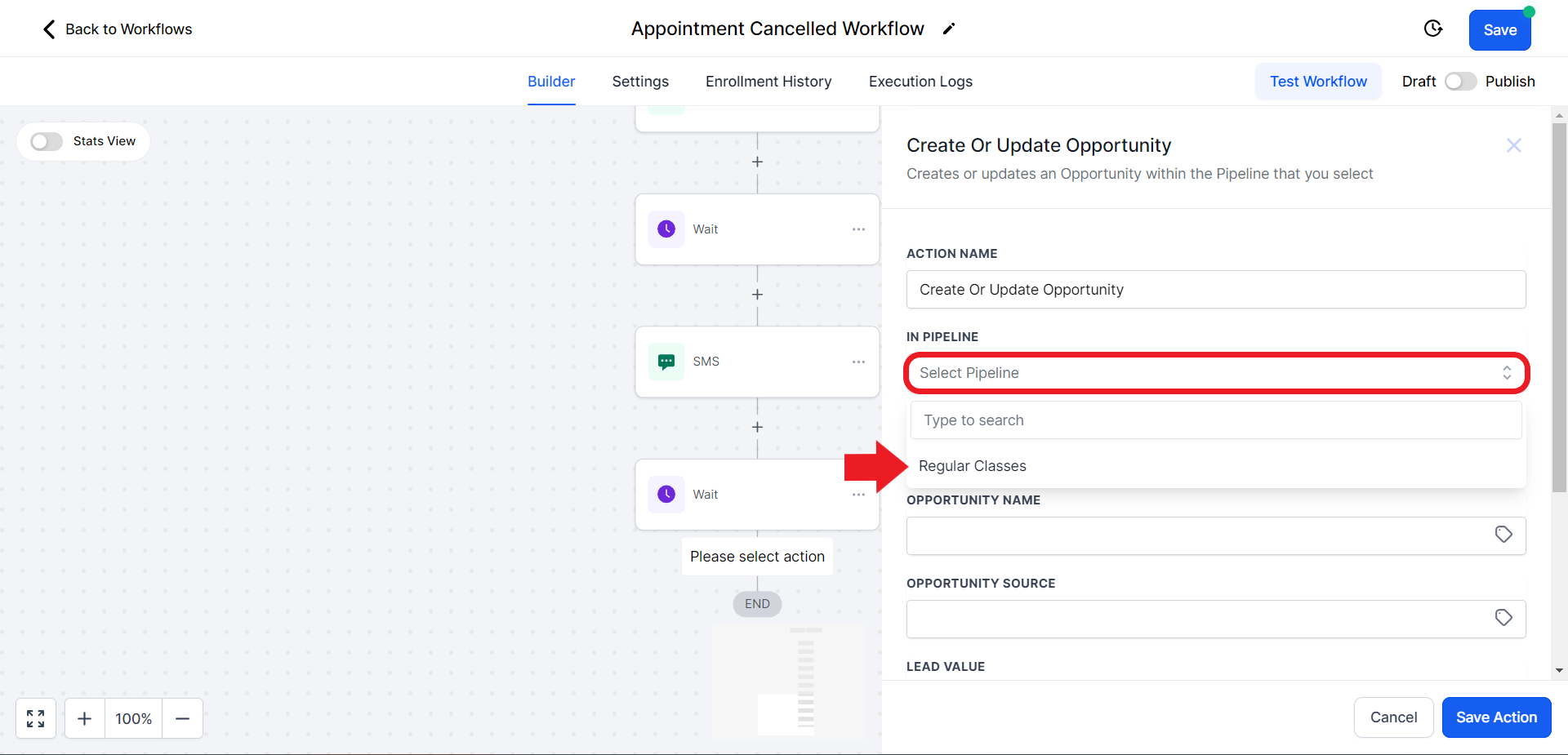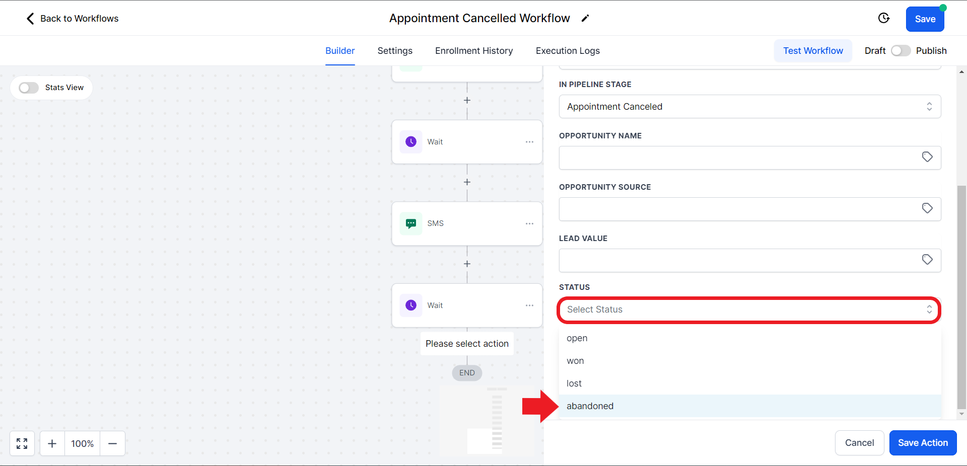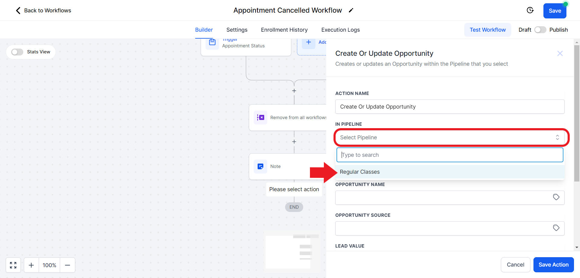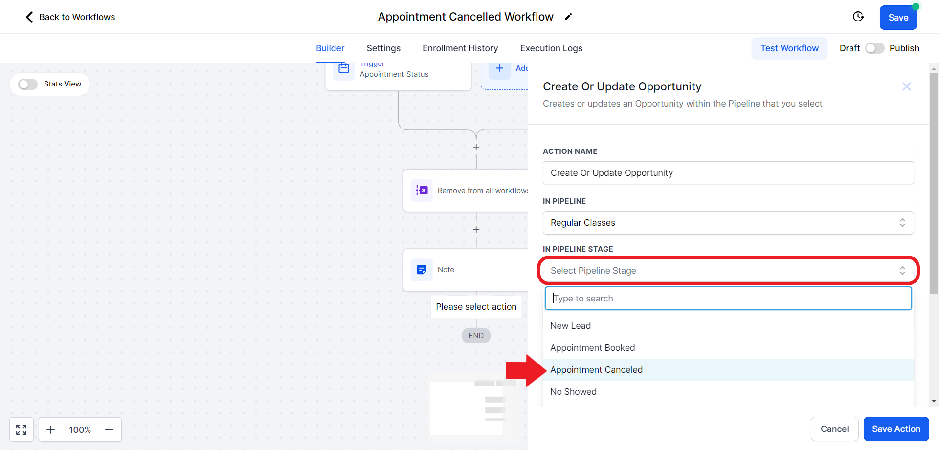 - Click on the "Select Pipeline Stage" field and from the drop-down menu choose the "Appointment Cancelled" option.