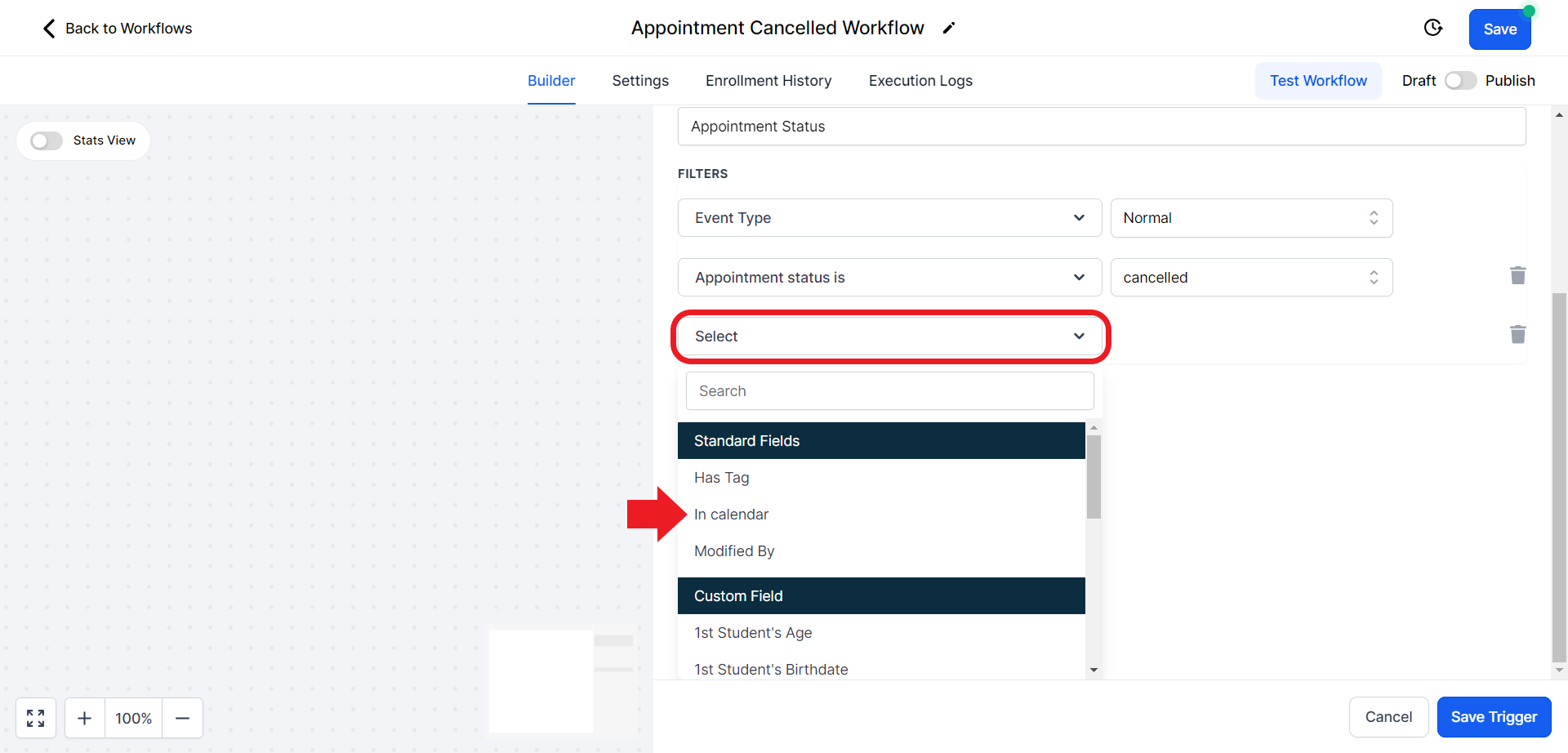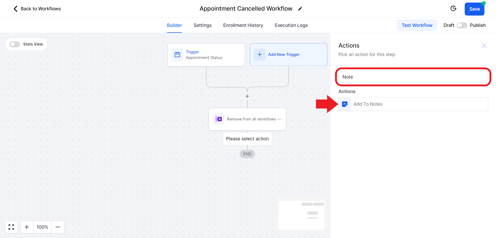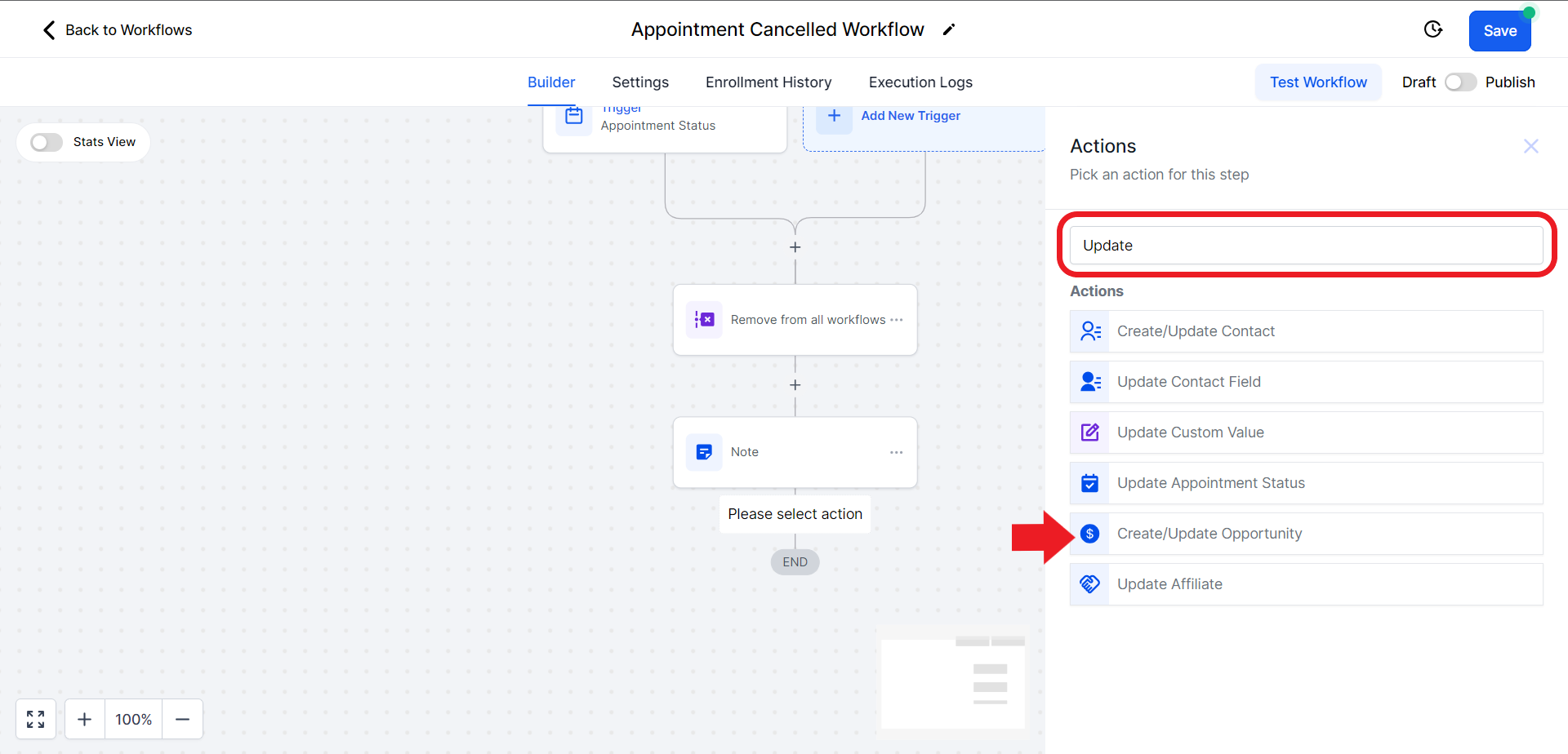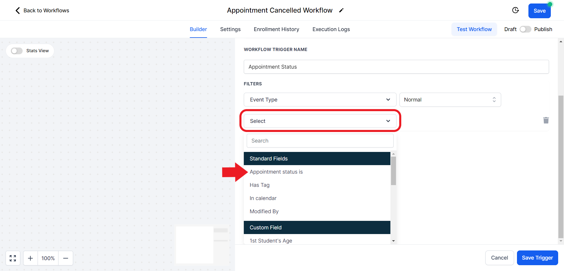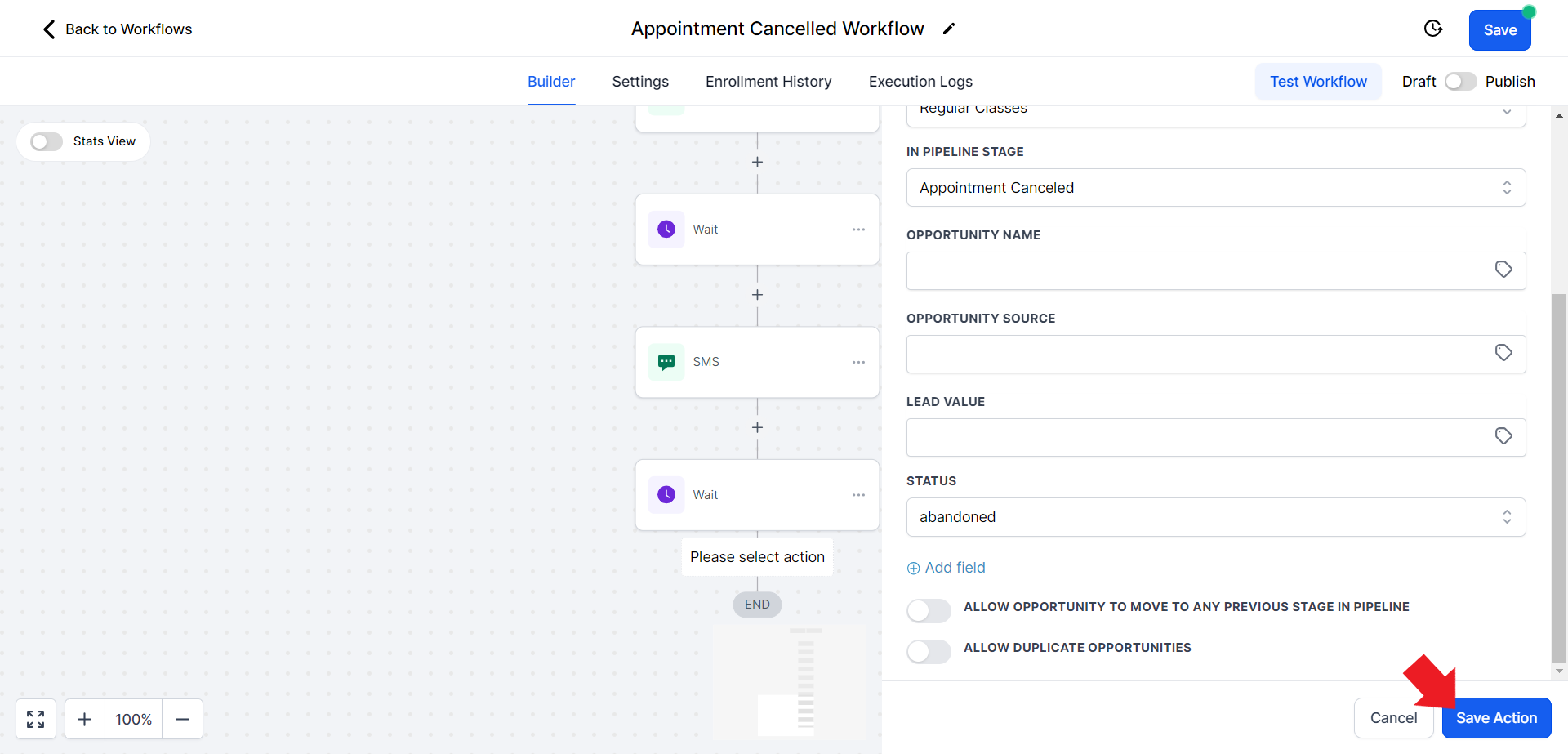 - Click on the "Select Pipeline Stage" field and from the drop-down menu choose the "Appointment Cancelled" option.