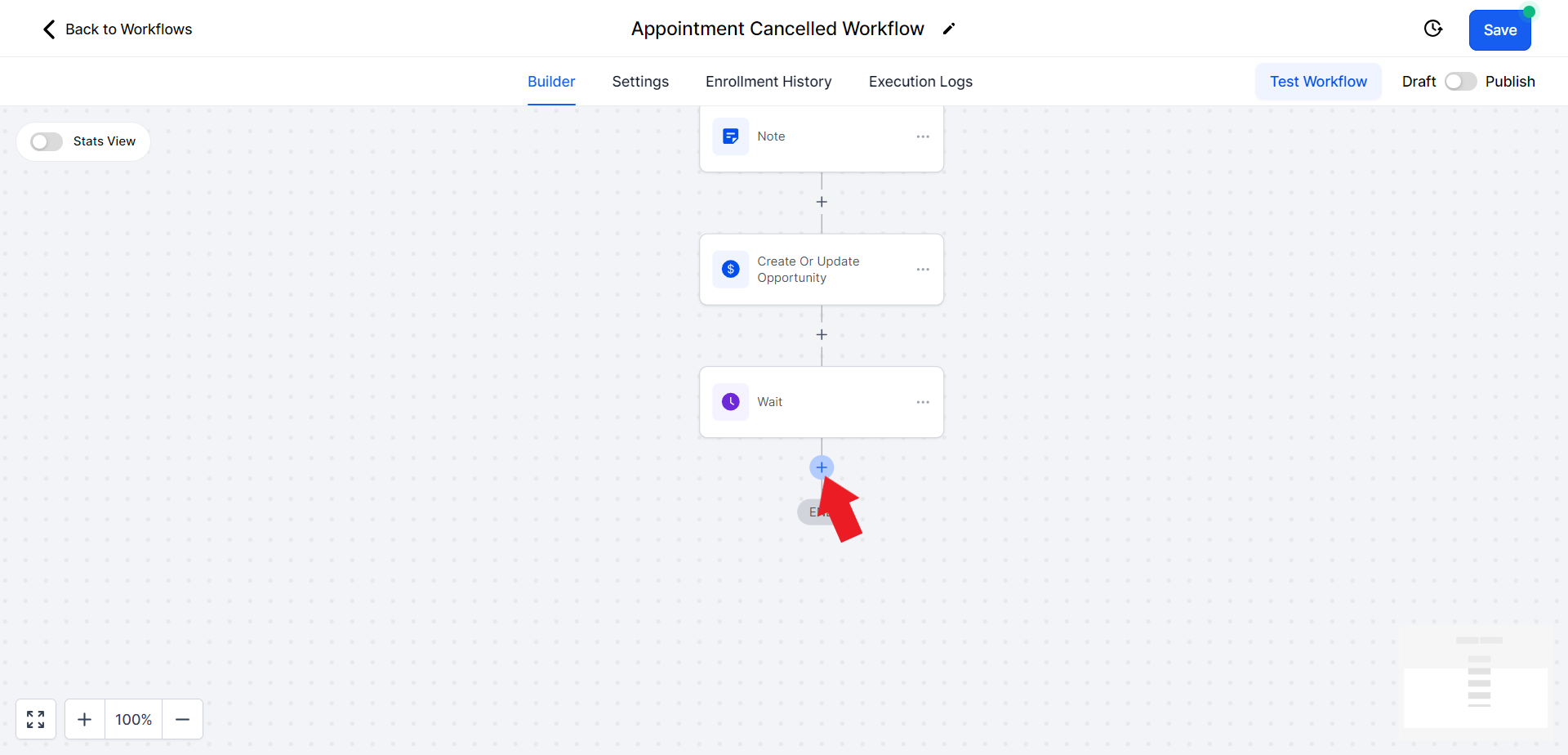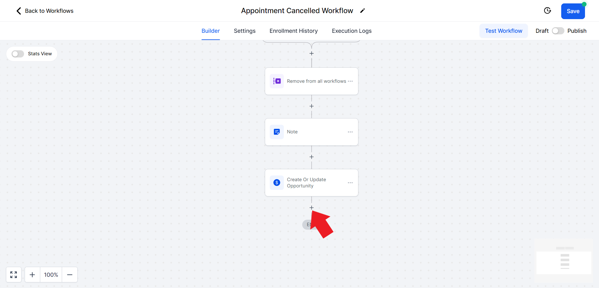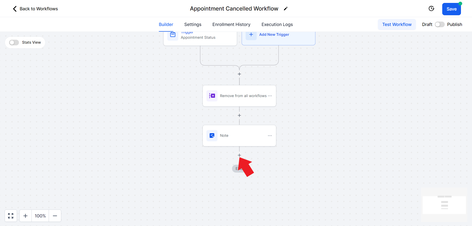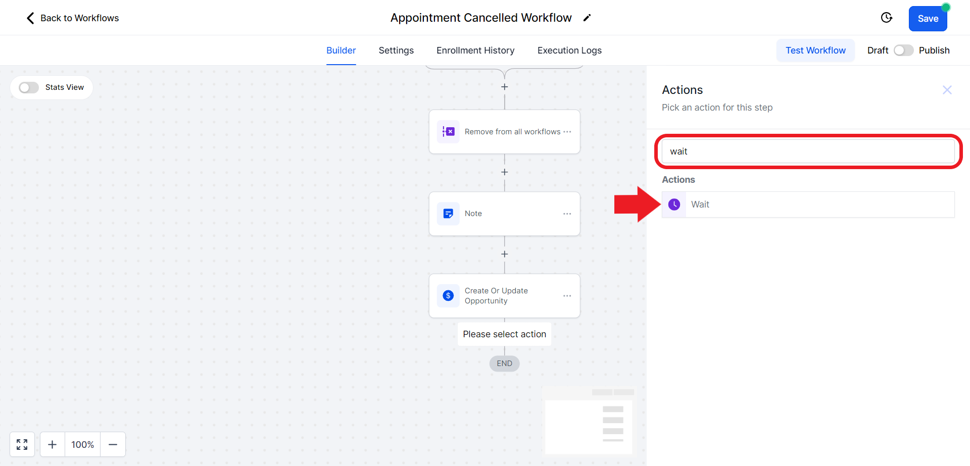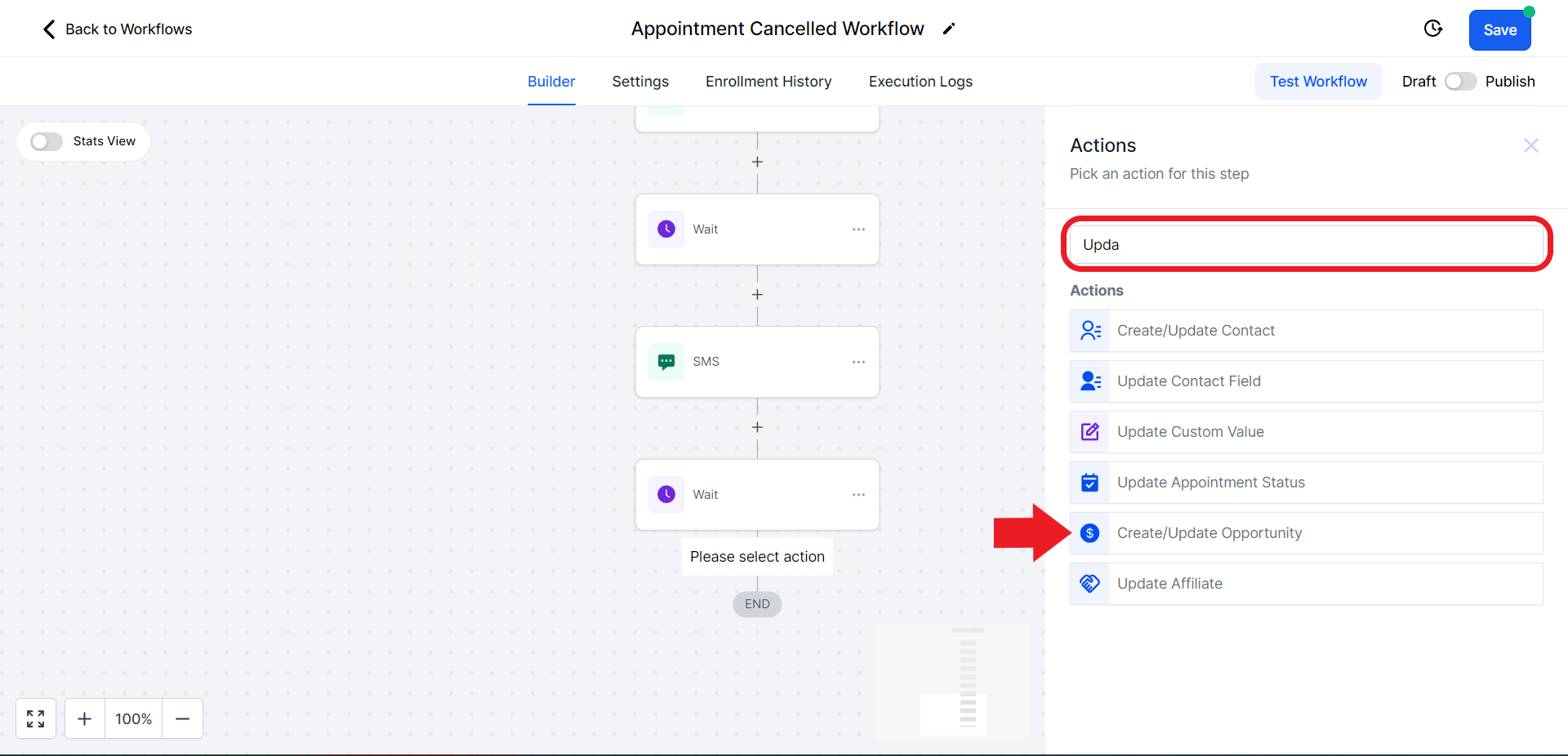 - Click on the "Select Pipeline Stage" field and from the drop-down menu choose the "Appointment Cancelled" option.
