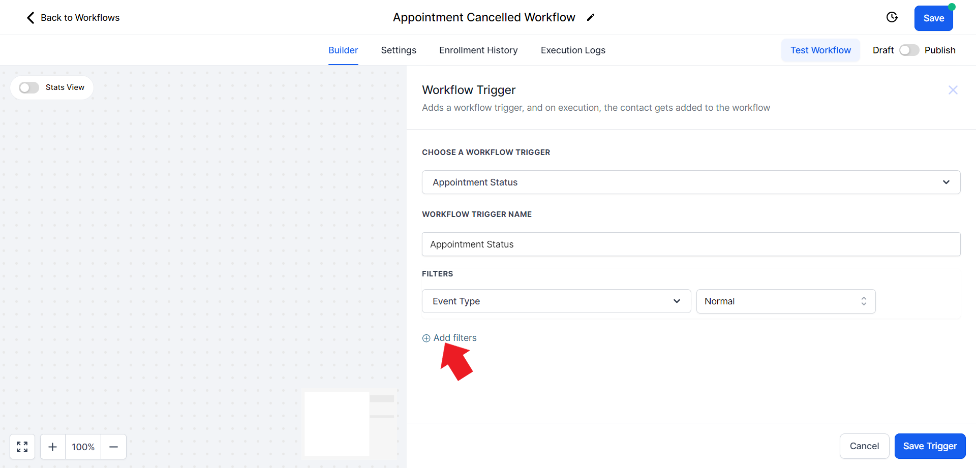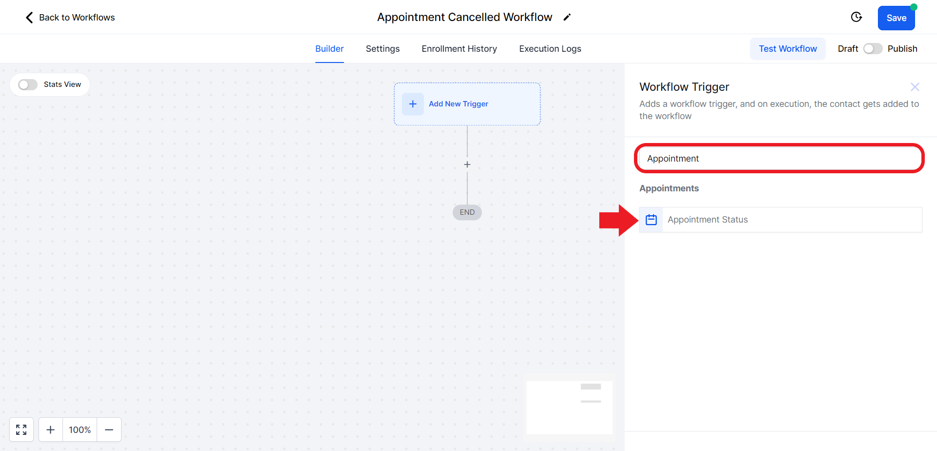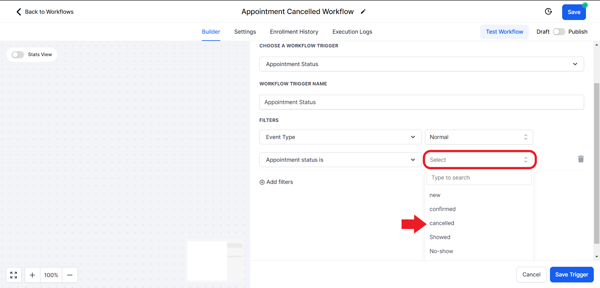 - This will open a Trigger search panel on the right. Search for the "Appointment Status" option and select it.