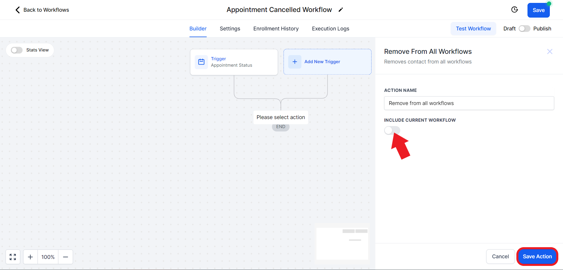 - Toggle the switch to disable "Include current workflow". Once done click "Save Action"