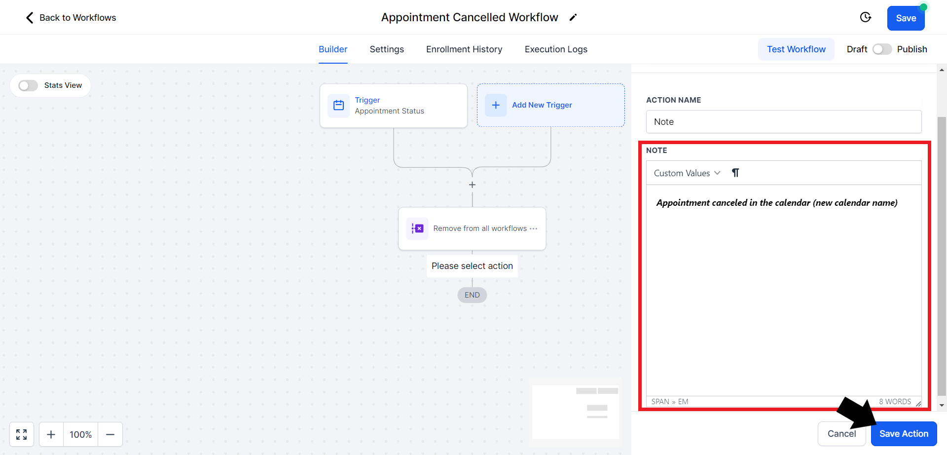 - In the note content, include a message like "Appointment canceled in the calendar (new calendar name)". Once done click on "Save Action"