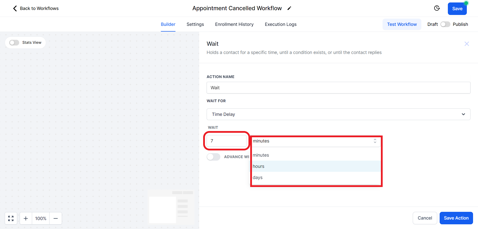 - Under the "Wait" section set the value and unit of time according to your preference