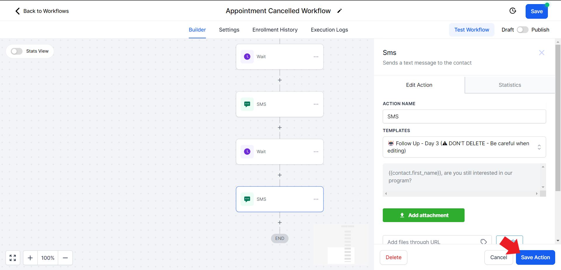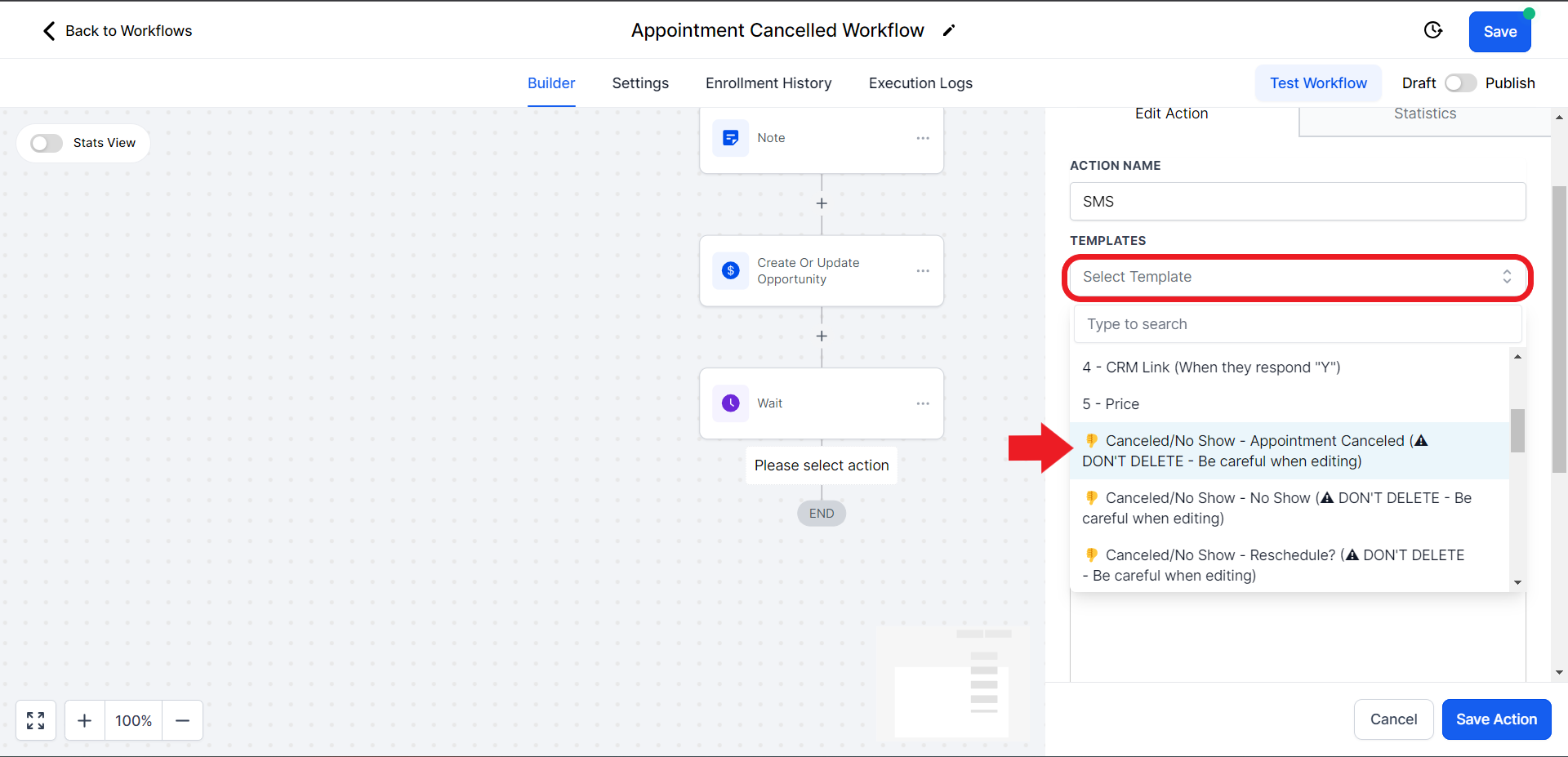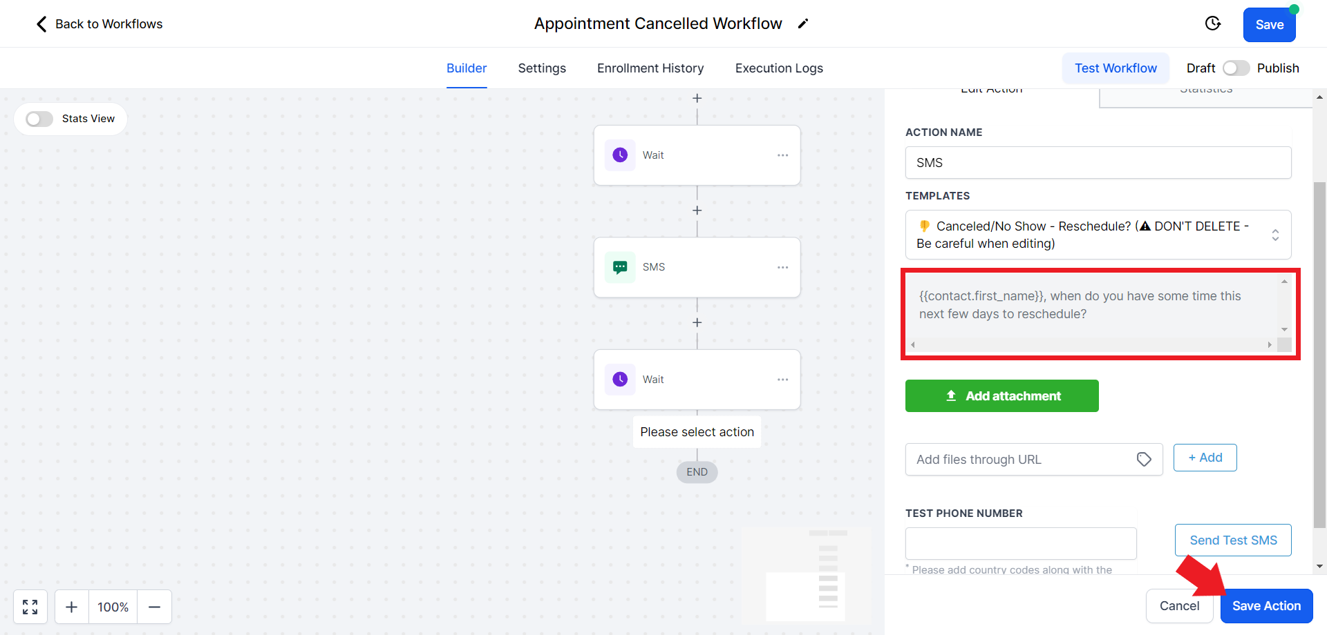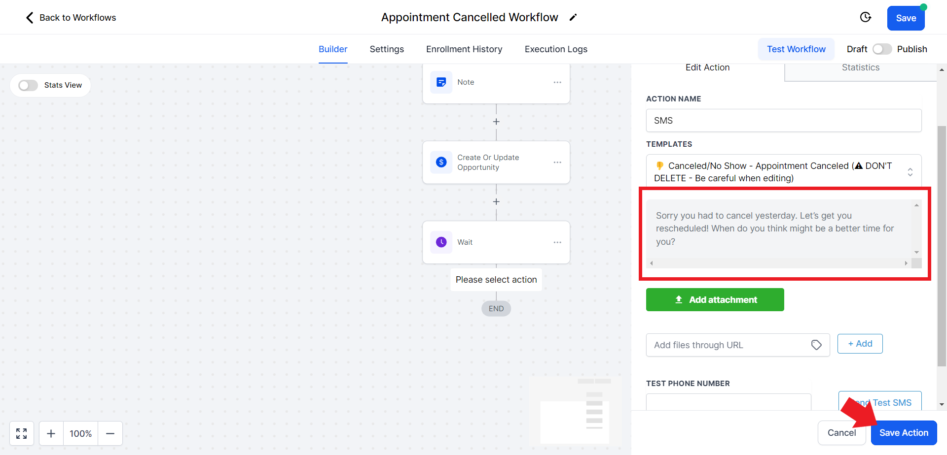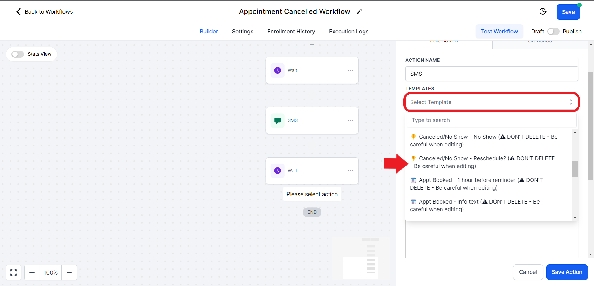 - Once you choose the correct template, it will automatically fill in the contents of the SMS. Hit "Save Action" once ready