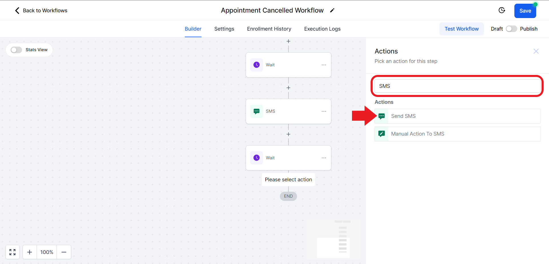 - In the Actions search bar search for "SMS" and click on the "Send SMS" option