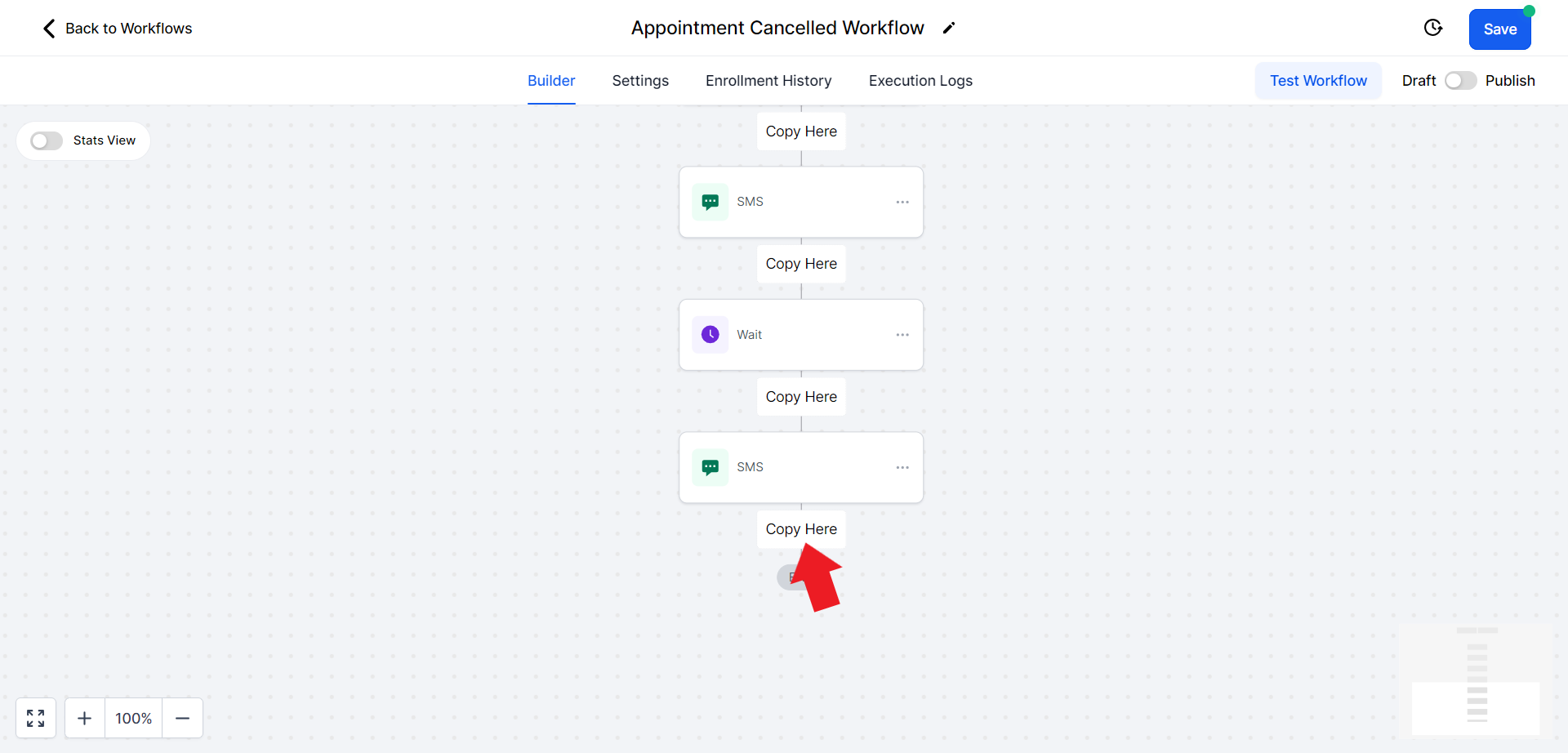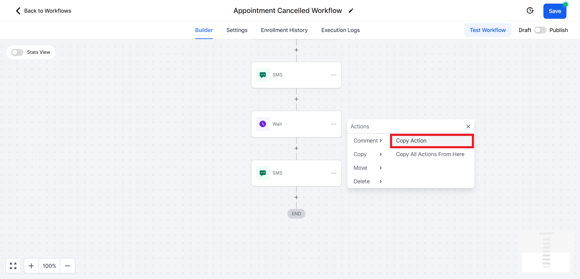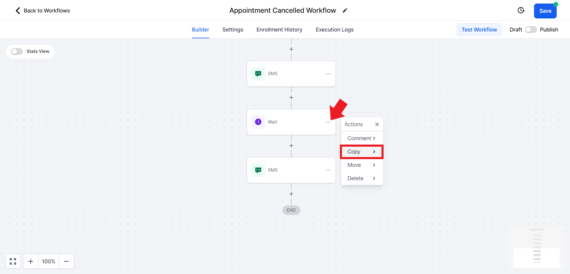 - Similarly, we will copy the "SMS" action and paste it below the recently created "Wait" action