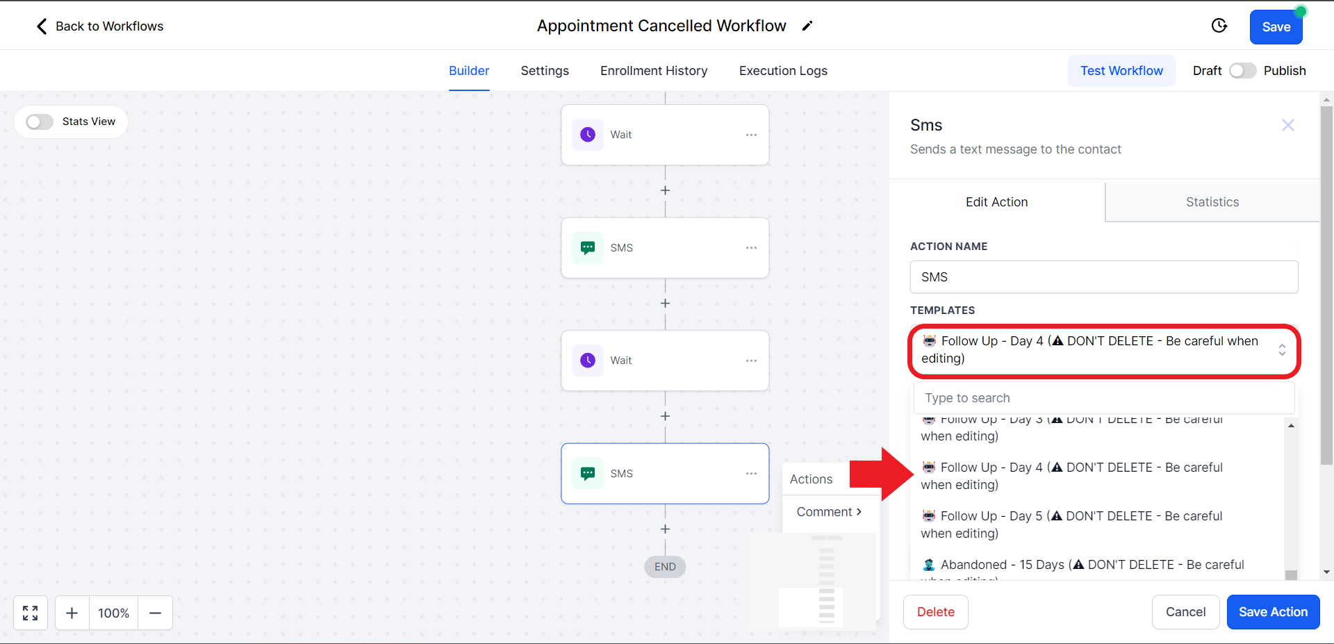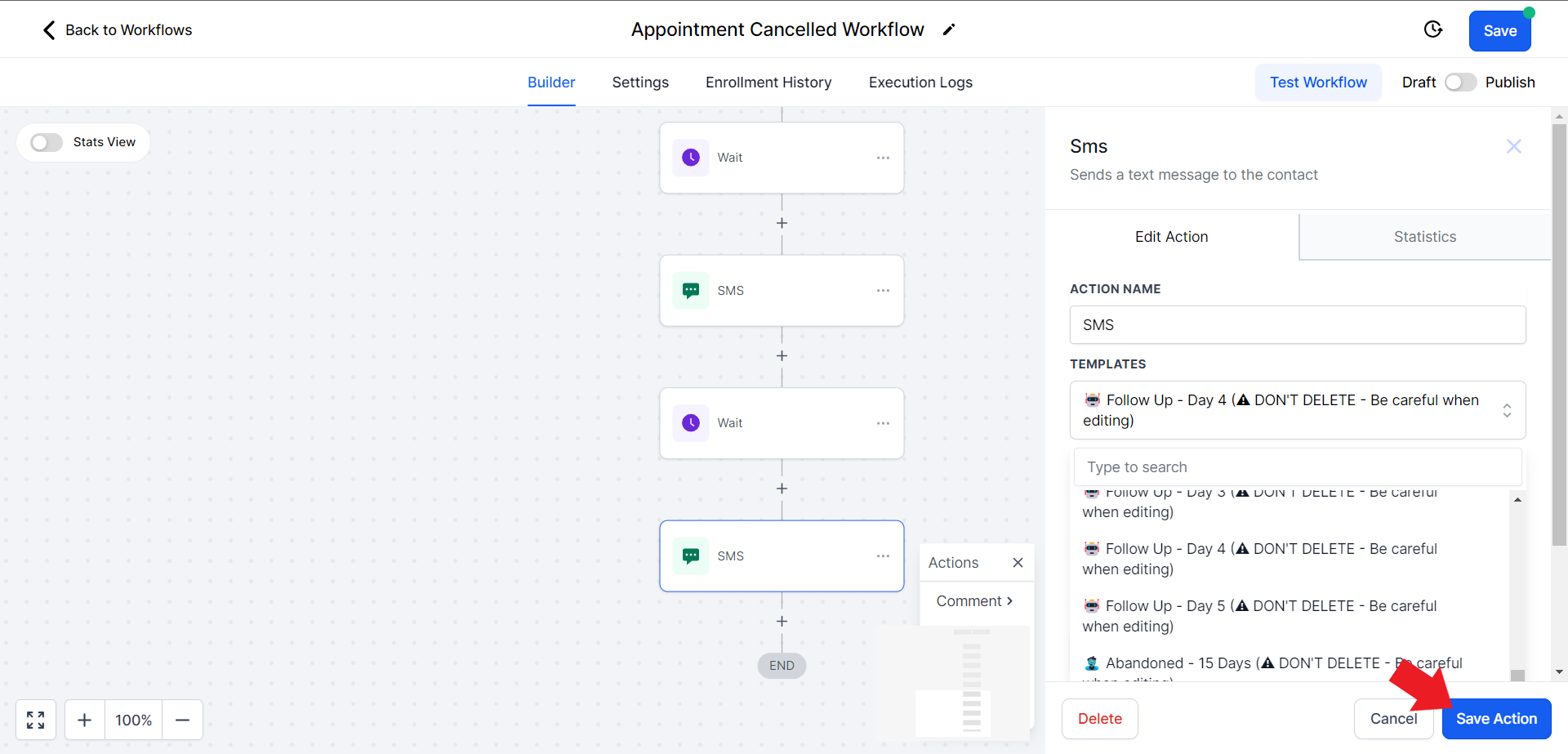 - Click on the SMS Action box and edit it. Click on the "Templates" option and choose "Follow-Up Day 5"