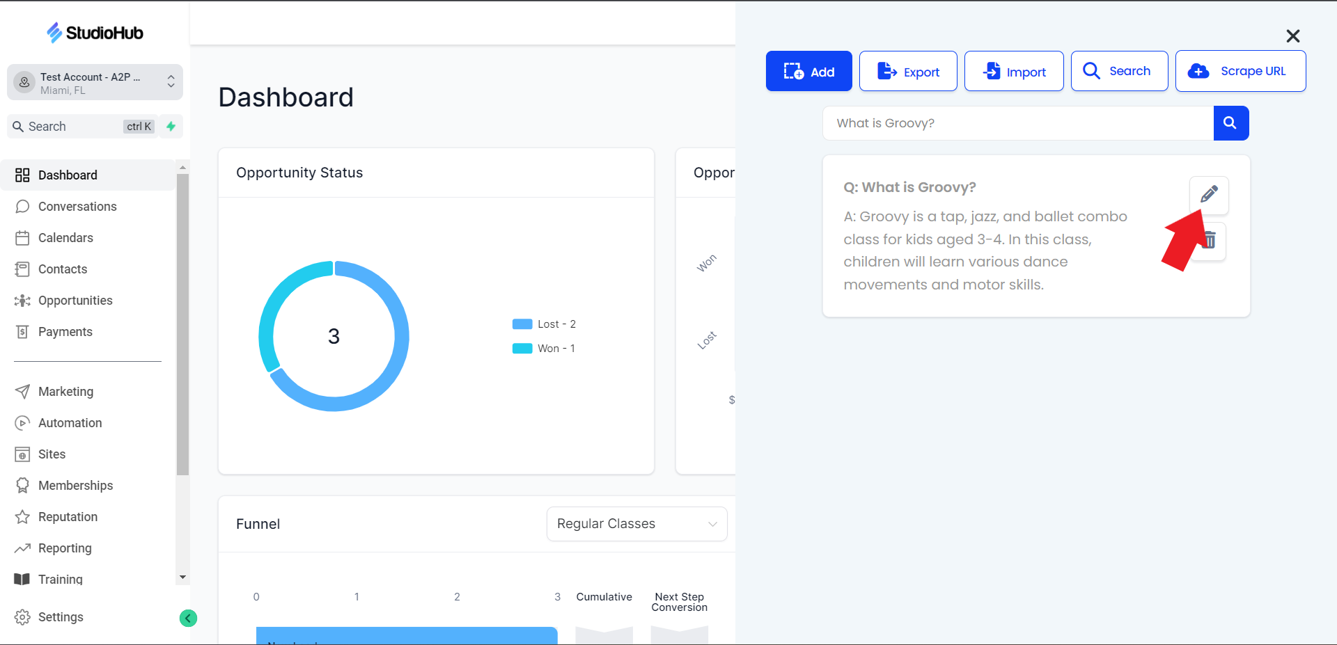 In the last guide, we successfully added your FAQs to the StudioHub Bot. However, it's natural for your dance studio's information and the questions you receive to evolve over time. In this guide, you'll learn how to edit, delete, and add FAQs to keep your bot up-to-date and responsive to your clients.