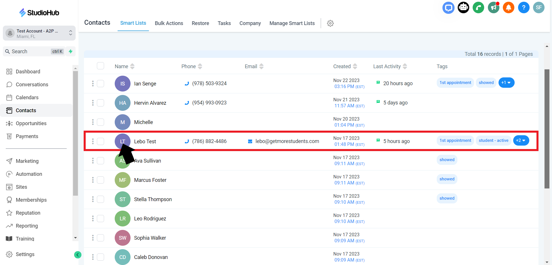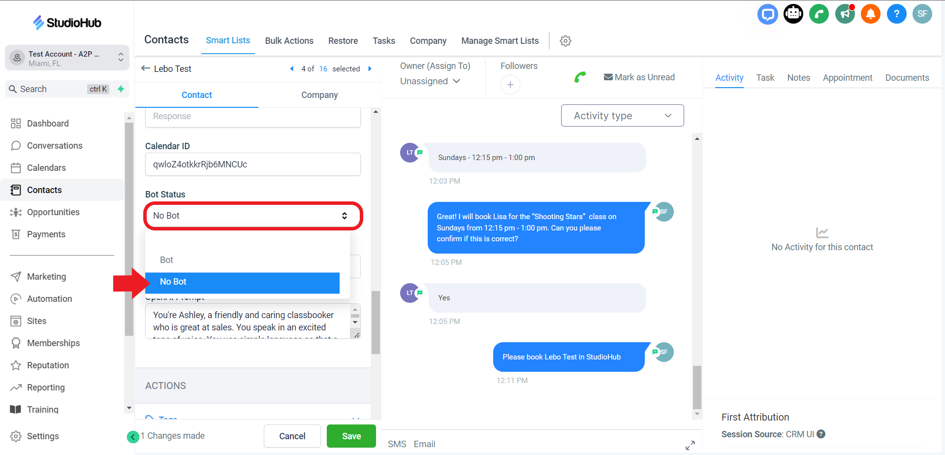 - In the contact's details section scroll down until you find the "Booking Bot" tab and click on it