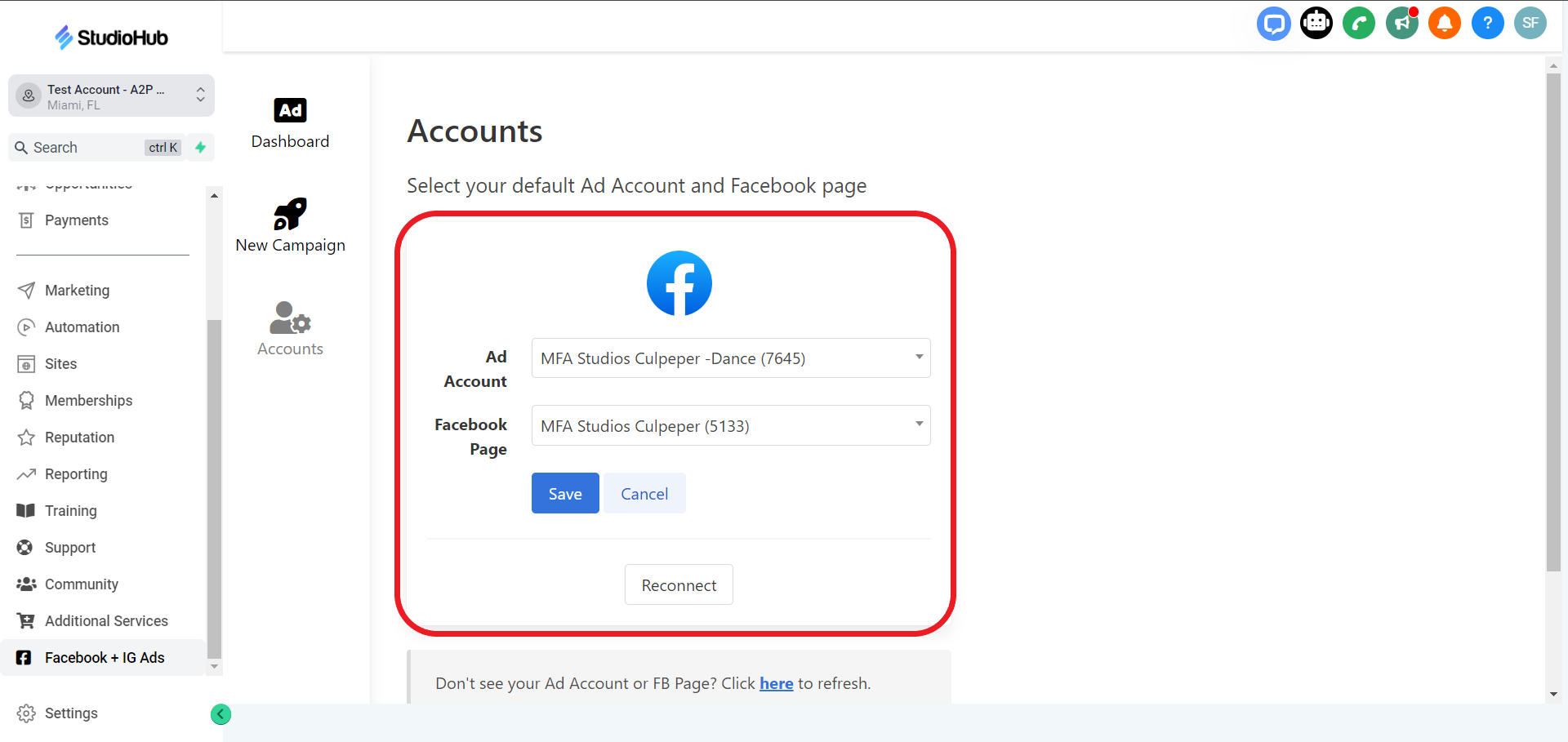 - Make sure your StudioHub account is connected to your Facebook account, if not then follow this guide here to learn how to integrate the Facebook account with StudioHub