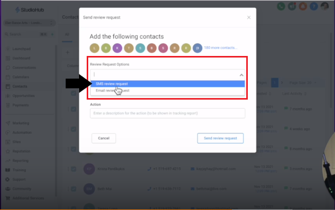 - In the next pop-up, click on the "Review Request Option" field and choose the option "SMS Review Request".
