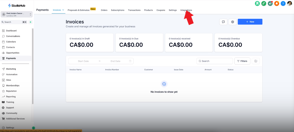 - Click on "Integrations" at the top. Follow the steps and connect your Stripe account with your StudioHub account
