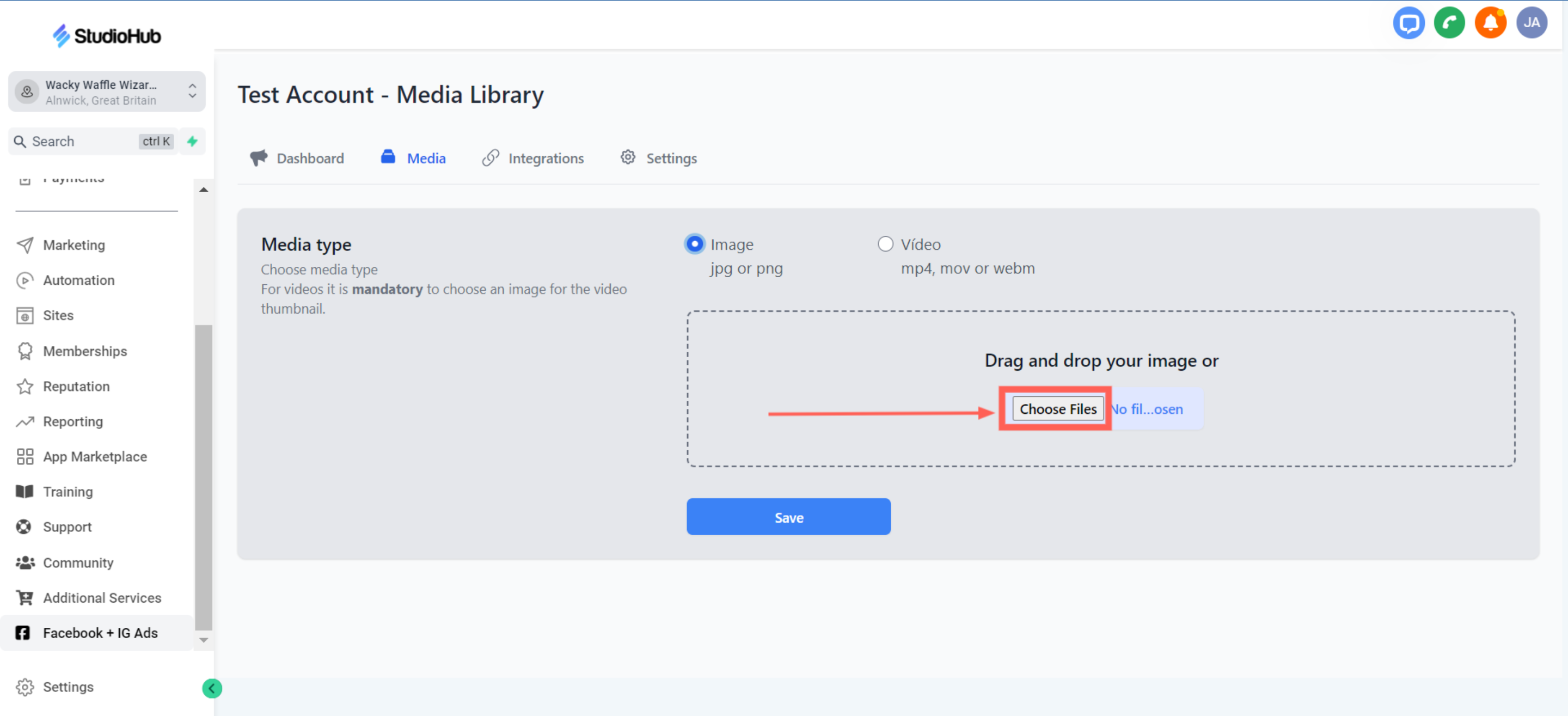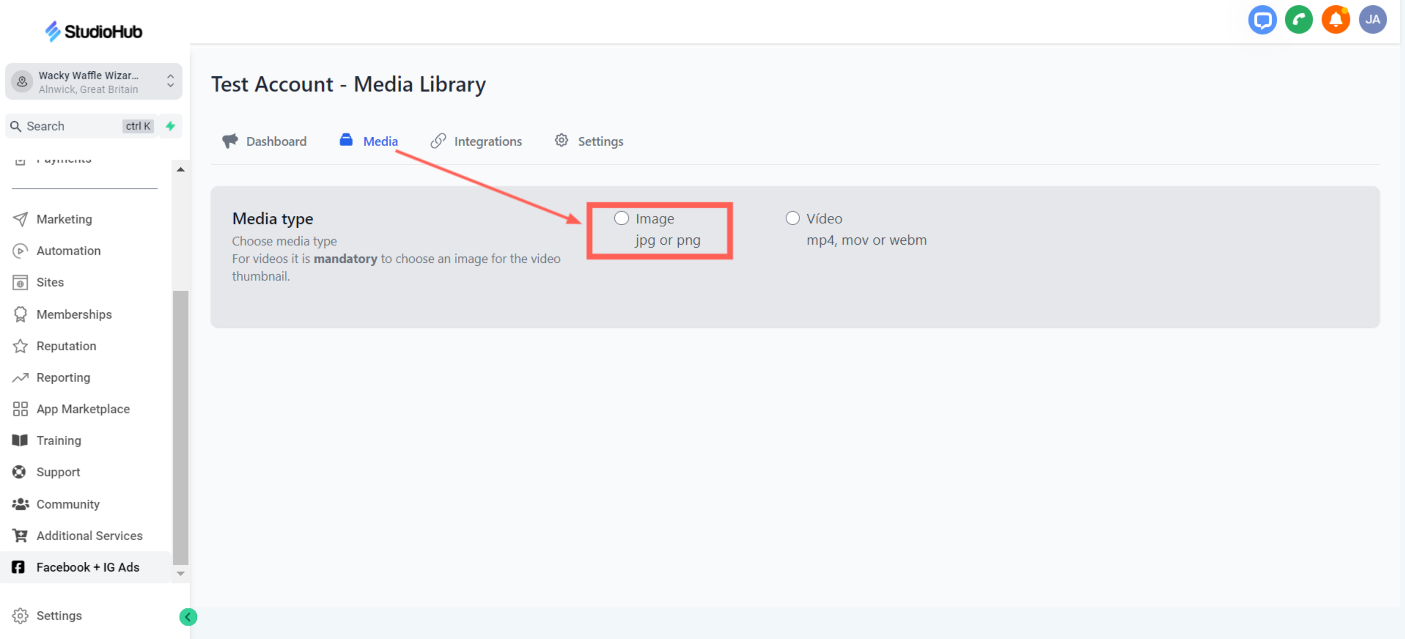 - Log in to your Studiohub account, and go to Facebook + IG Ads.