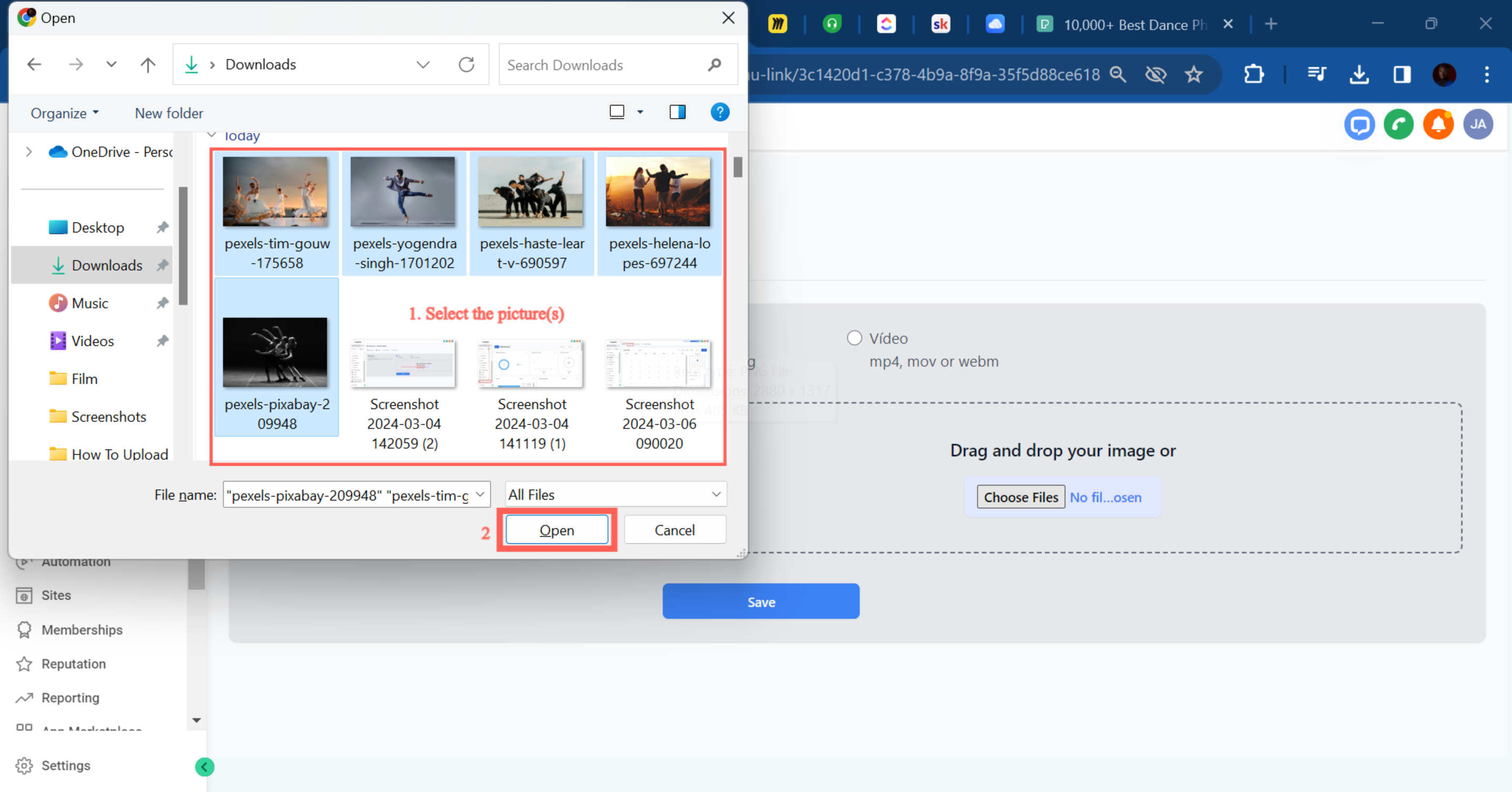 - A window will open up for you to select the picture(s) you want to upload (you can select multiple pictures at once) and then click on "Open".