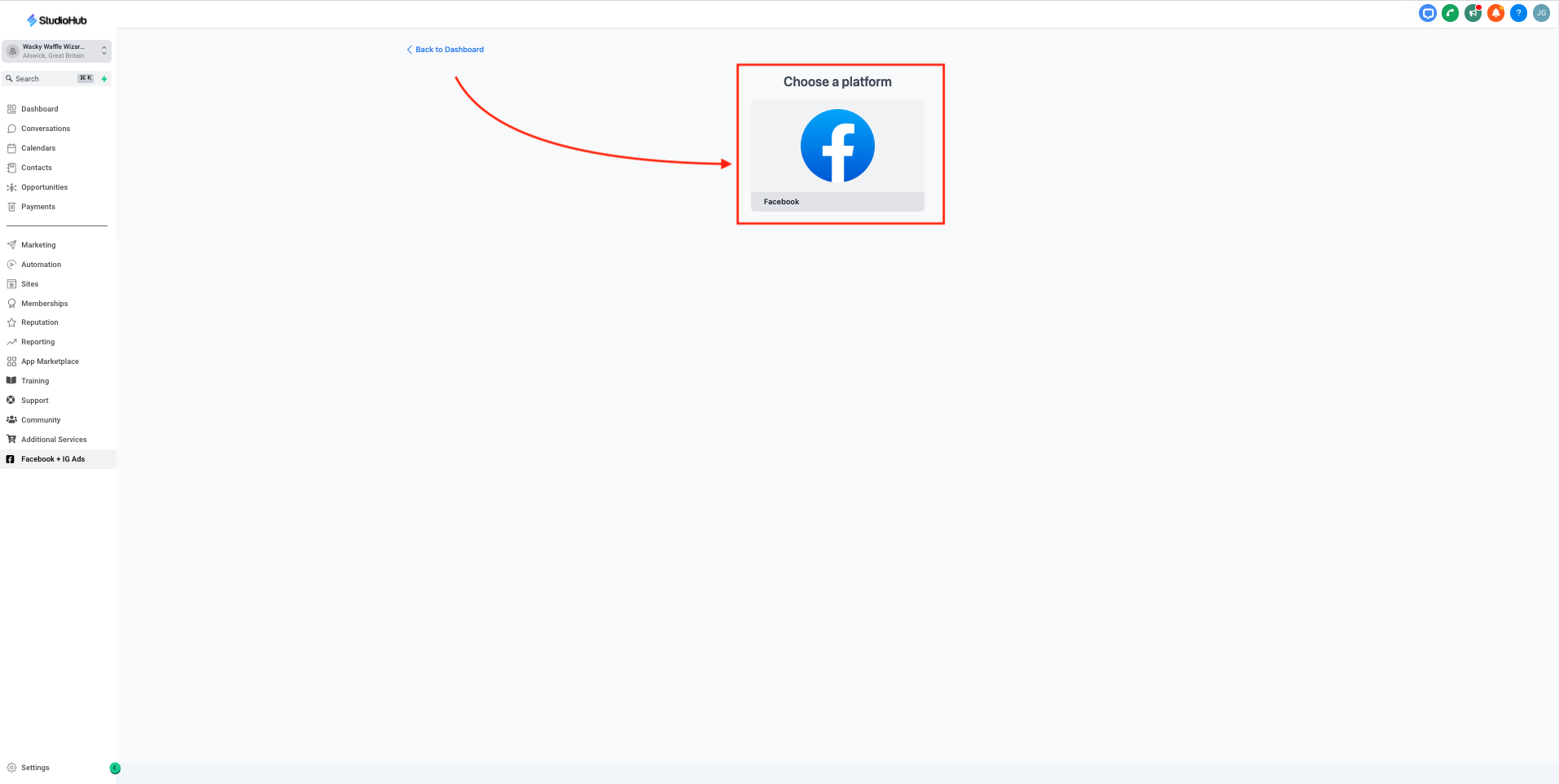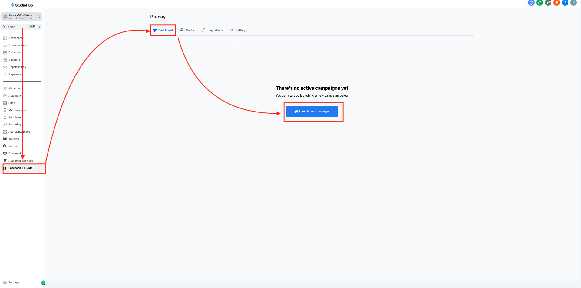 Open the Ads Launcher by clicking on Facebook + IG Ads at the bottom left of the screen.