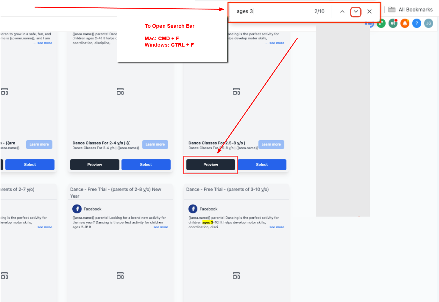 - If you already have a specific template in mind, you can use the search bar (Mac: CMD + F, Windows: CTRL + F) with a keyword to find it quickly. For example, if you're looking to promote classes for kids that are three years old, type "ages 3" in the search bar and click Preview.