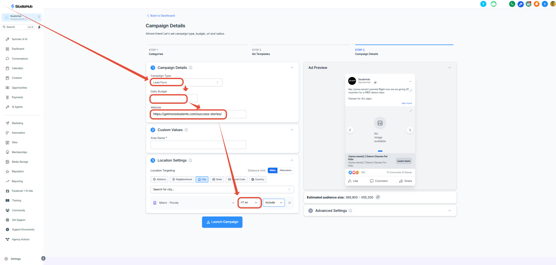 Radius: Select the number of miles you want to target around your studio. (e.g. 7)
