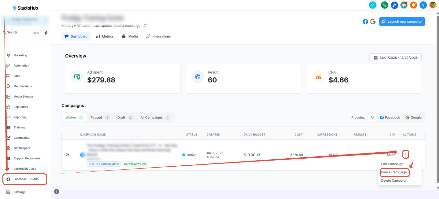 - Log in to your StudioHub account and select Facebook + IG Ads.