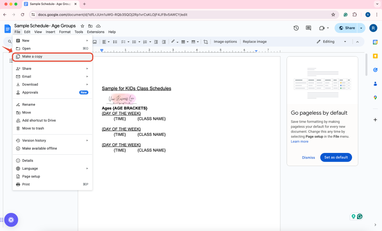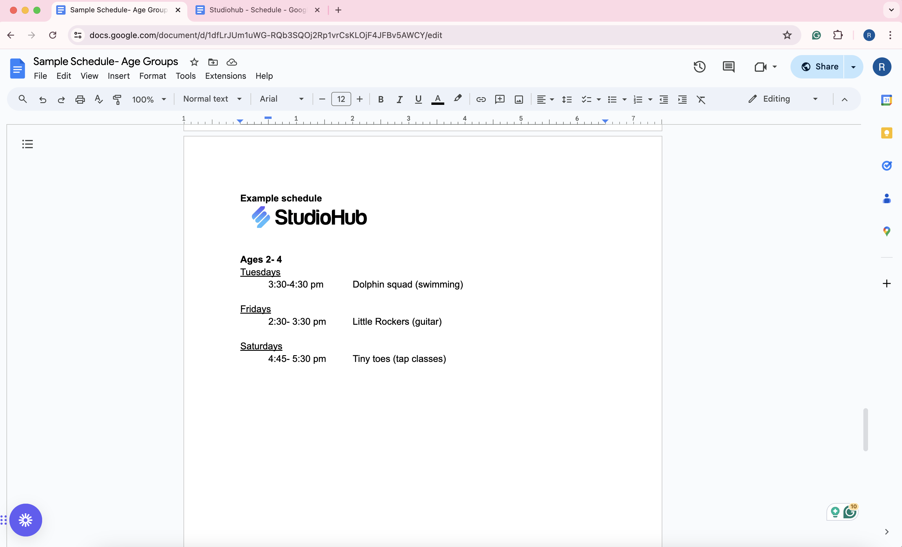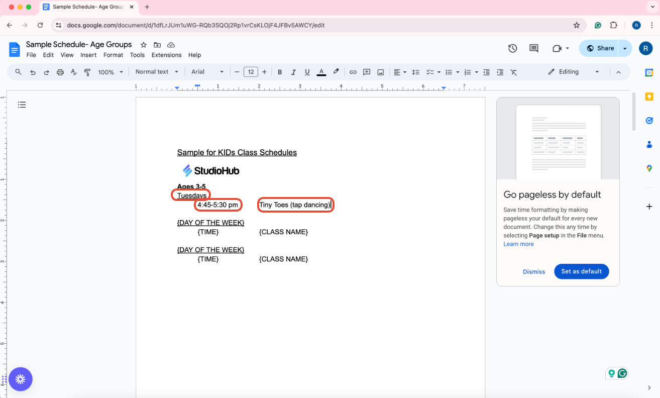 In this guide, you will learn how to prepare your class schedules for kid group classes according to their age groups in a Google Document for your Studiohub templates.