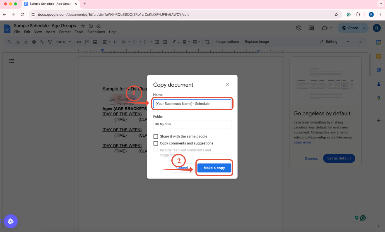 - Rename the copy as "{{your business's name}}- Schedule" and then click "Make a copy"