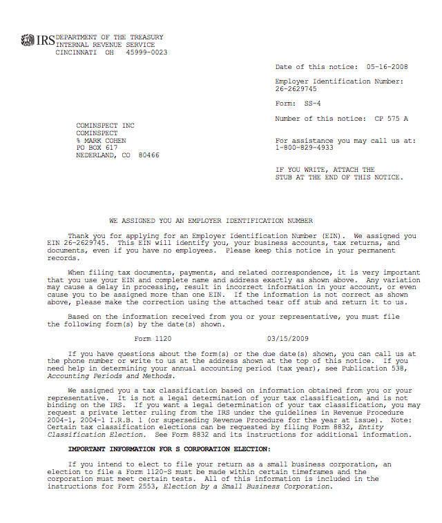 This is the document that looks like this, which contains your EIN and official business address.