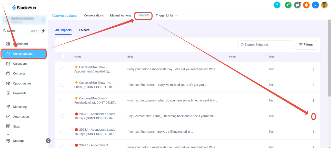 - Find the Snippet you want to edit. For example: 2023.1 - Abandoned Leads - 30 Days (DON'T DELETE - Be careful when editing).