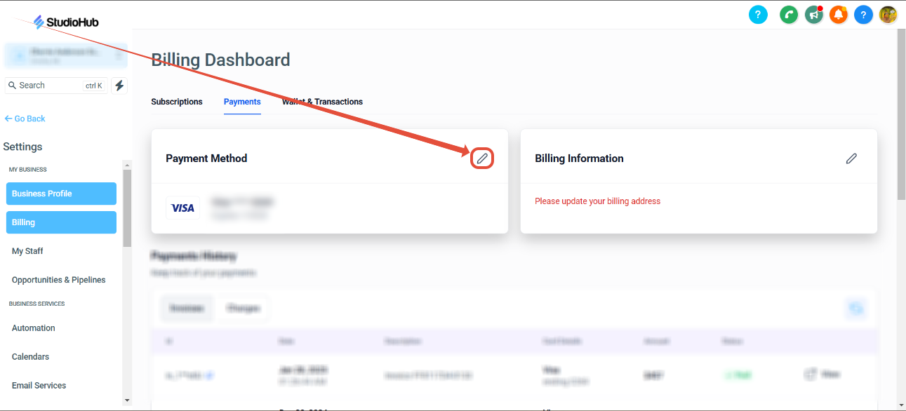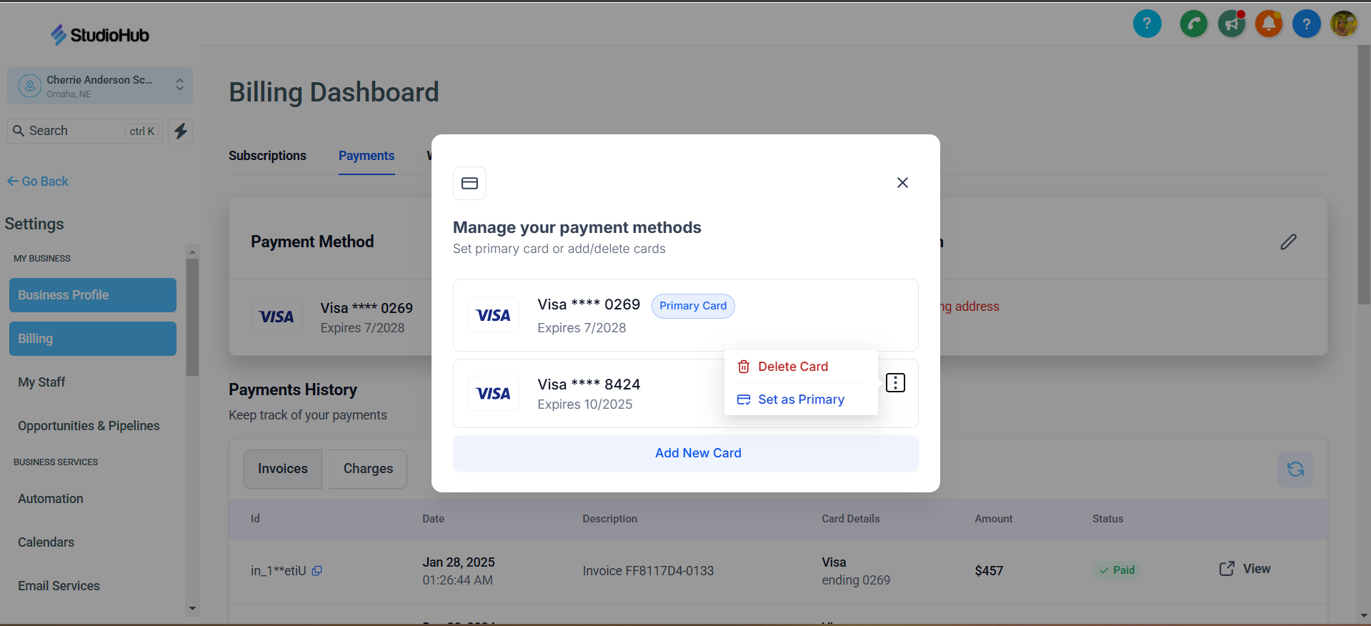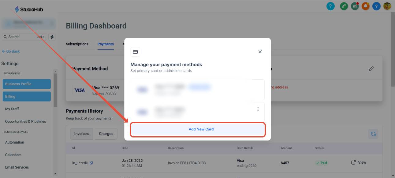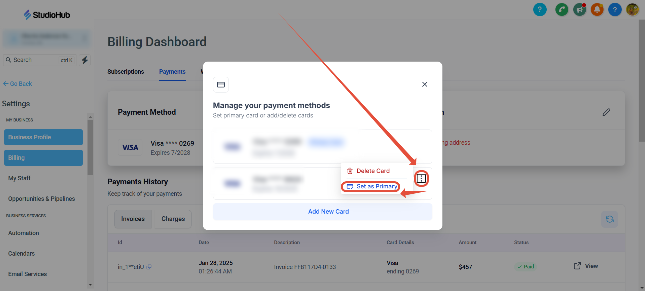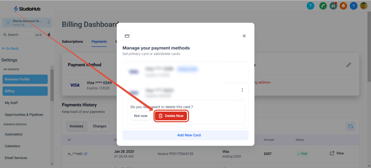 After you've added your new card into StudioHub payment settings, please delete the card that you no longer want us to use for billing purposes. Warning: Forgetting to delete your old card might cause you to get billed on the wrong card. Please ensure you have completed Step 5 before moving on to Step 6 as the system will not let you remove the primary payment method
