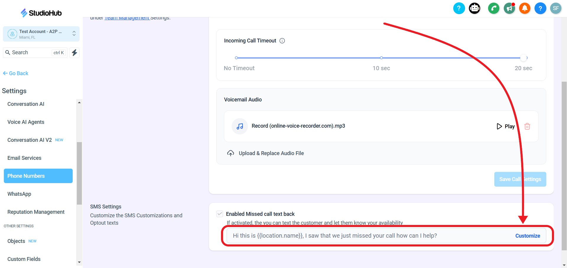 This guide will help you customize the messages sent to clients and leads after a missed call.